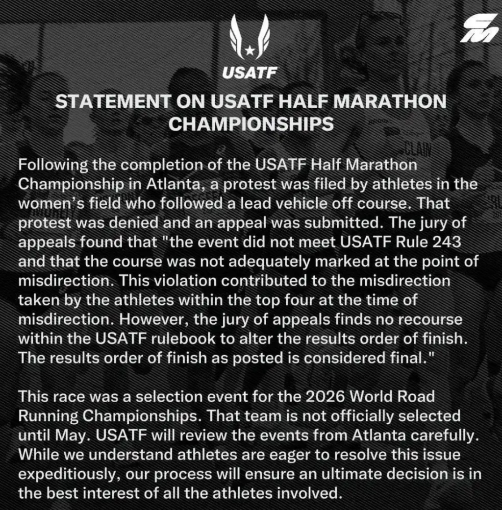 此外,在对于参赛选手的申诉进行初步核查后,美国田径协会也表示,此次赛事的引导车是由当地赛事组委会亚特兰大田径俱乐部进行协调安排,他们也会对亚特兰大田径俱乐部进行进一步审查。